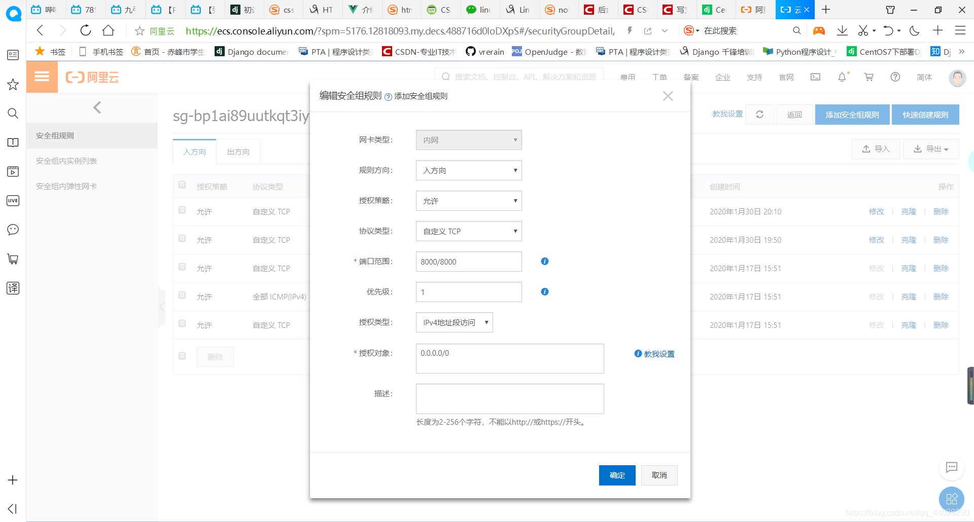 pip3 install django==2.1.这里用的是2.1版本,然后建立django项目。 - 阿里云一些配置,找到自己服务器的本实例安全组,然后新建规则,配置如下图