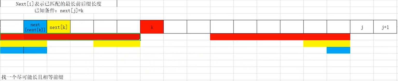那么如果不等怎么办呢。这时看图的第二行,首先我们可以证明黄色的部分都是相同的。那么很明显只要让k=next[k]就可以再比较了。如果相等,接着各自加1.不过这里可能你会有个疑问,为啥k要跳到next[k],才是最长的前缀呢。这里我们就要了解下next[k]的含义next[k]的含义是,k位置前的字符串最大前缀的末尾的下一个。仔细看一下图,你可能就会略懂了。而第三行蓝色的则是next[k]位置的元素和j位置的元素还不相等,那么k = next[next[k]]